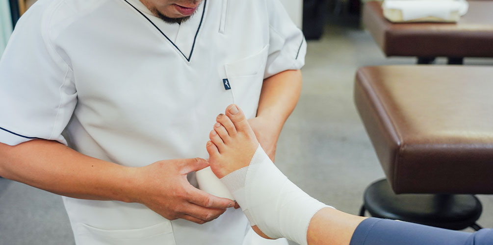 痛めた部位を包帯やテーピングで適度に圧迫する事で腫れや炎症を抑えます。